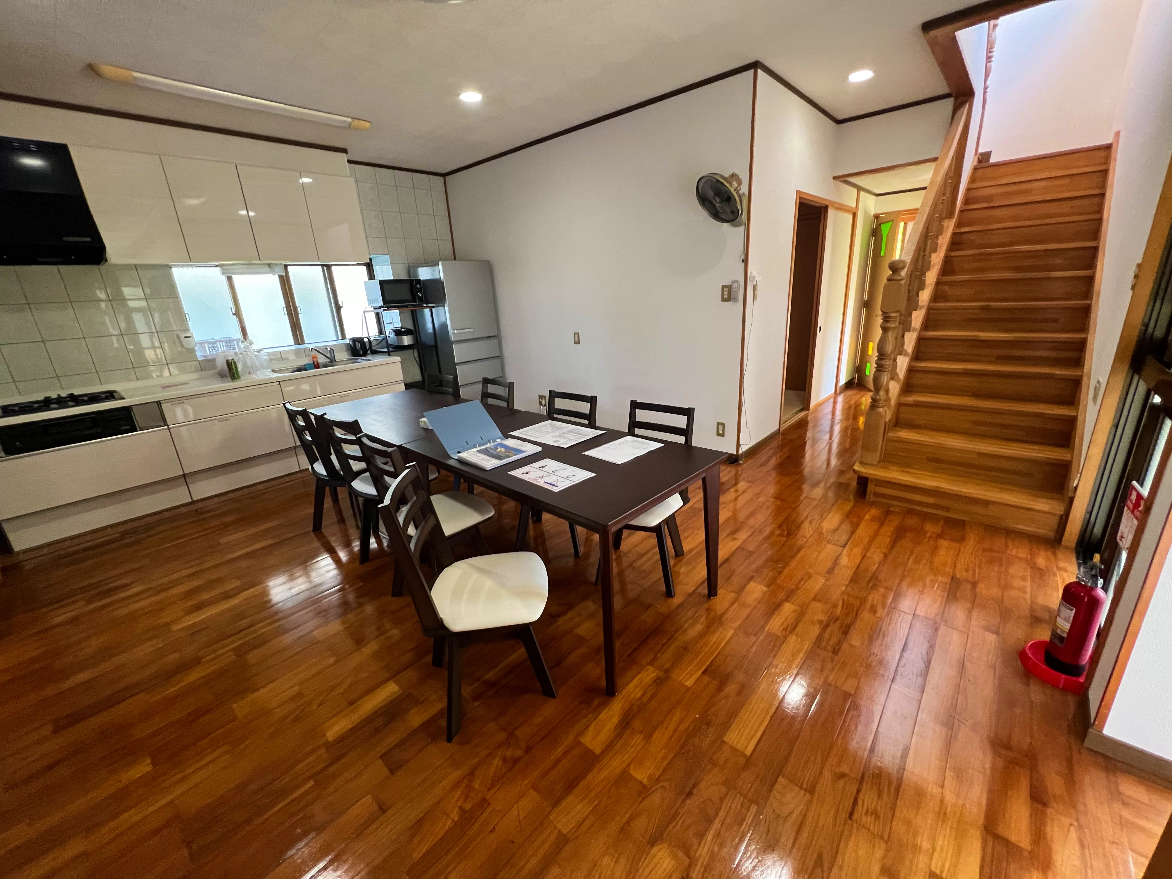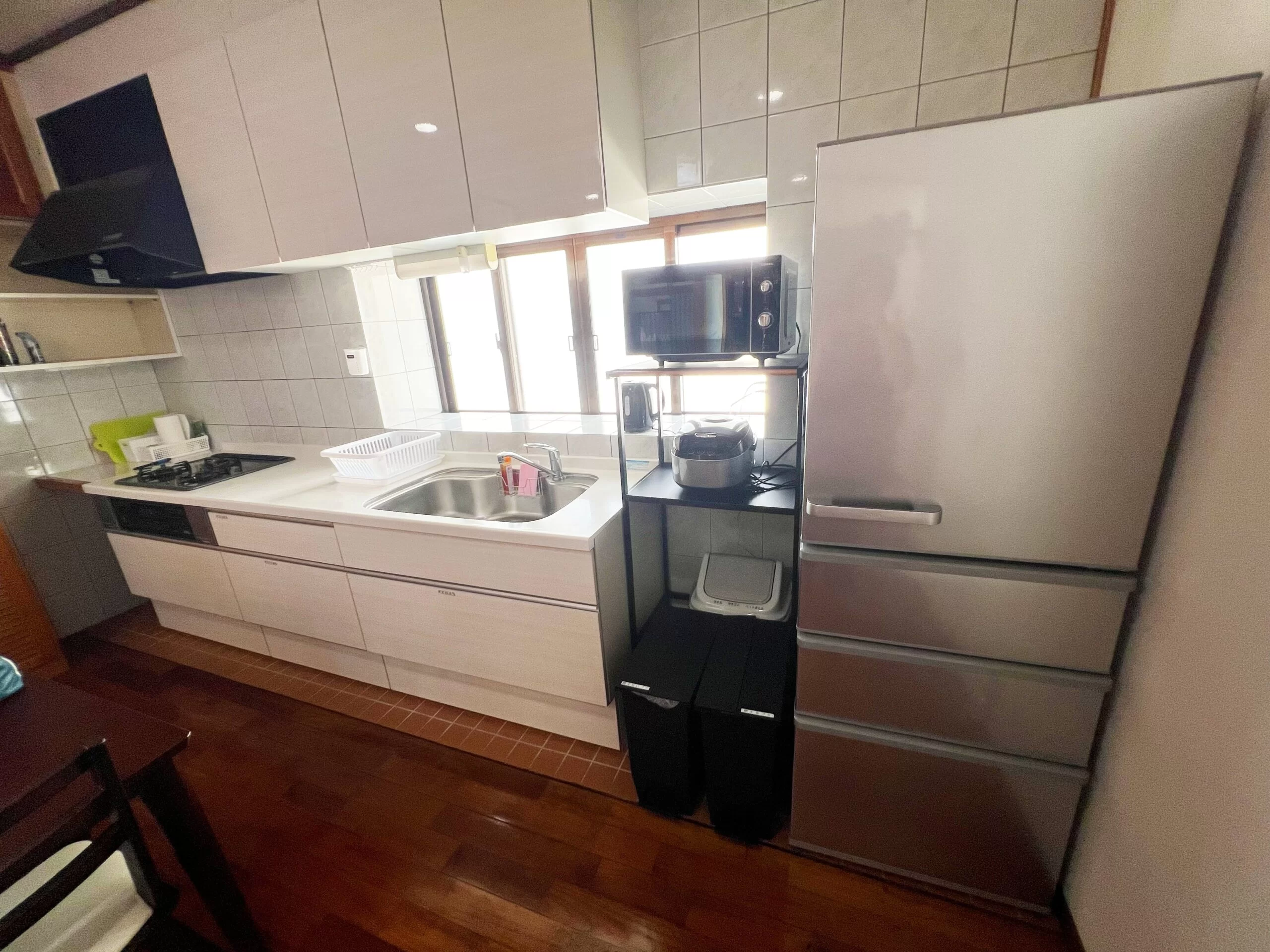 また、システムキッチンには大型冷蔵庫、3口ガスコンロ、炊飯器、各種調理器具と食器も完備されており、長期滞在でも安心です。さらに、洗浄機能付きトイレやバスタオル、シャンプー類も揃っているため、最新の設備を兼ね備えた懐かしい大豪邸で至福の時間をお過ごしいただけます。