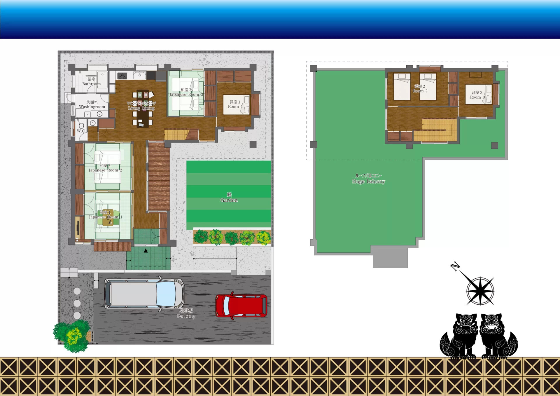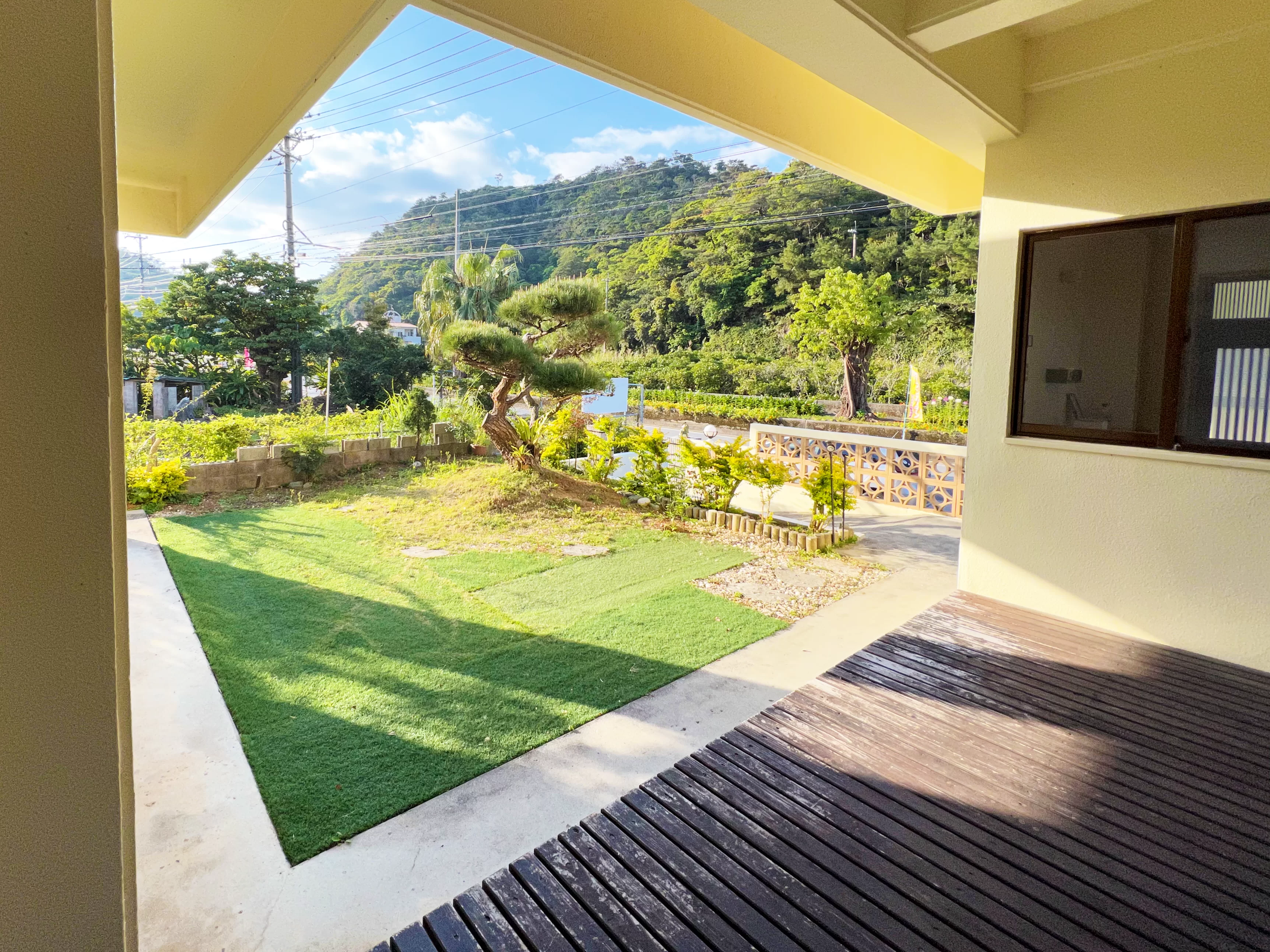 広い庭とルーフバルコニーからは、田園風景や汀間川のせせらぎ、大きなやんばるの山々を一望でき、それぞれの空間でバーベキューや憩いのひとときを楽しめます。